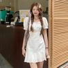 Letní nový francouzský styl retro jednoduchý jemný volánkový límec jednobarevný, přiléhavý pas, krátké šaty s bublinkovým rukávem