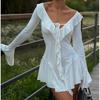 Francie Elegantní Jednobarevné šaty s hlubokým výstřihem do V Móda Štíhlý Dlouhý rukáv Šněrovací Oblečení Návrhář Šik tenké Sexy krátké šaty Ženy