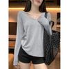 Solid color basic V-neck, right-shoulder, long-sleeved T-shirt for women in autumn, loose and slim, unique and beautiful bottoming shirt top