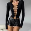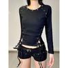 Spring Women's New Spice Girl Style Solid Color Embroidered Strap Long Sleeve Low-neckline T-shirt