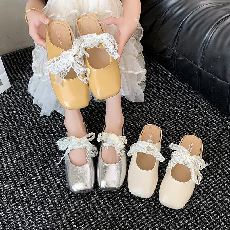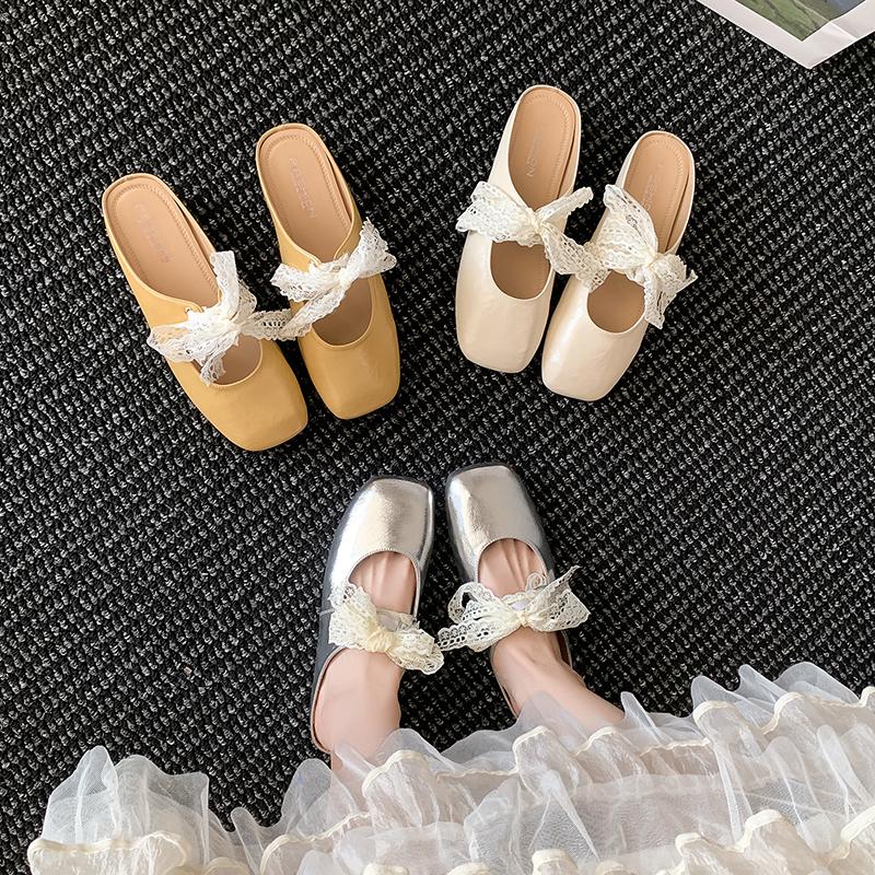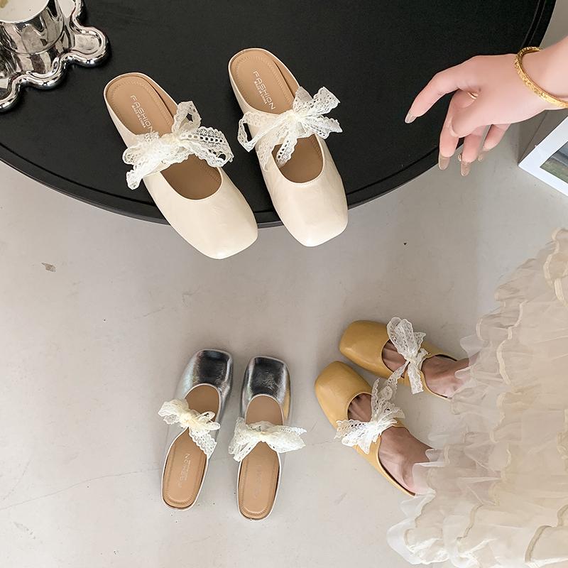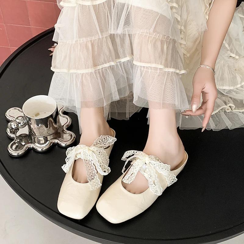 Fashion Baotou Flat Shoes Women Fashion Square Head Shallow Mouth Lace Lace-up Butterfly Knot Soft Sole Non-slip Slippers