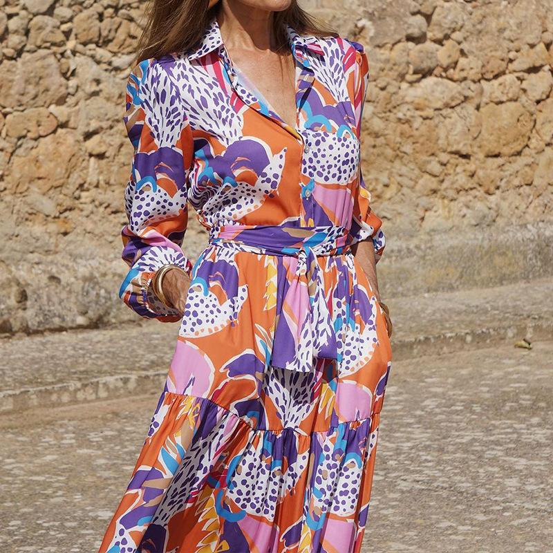 YYFS Women's Fashion Spring Fall Flower Pattern Print Long Sleeve POLO-Neck Middle Waistline Casual Dresses