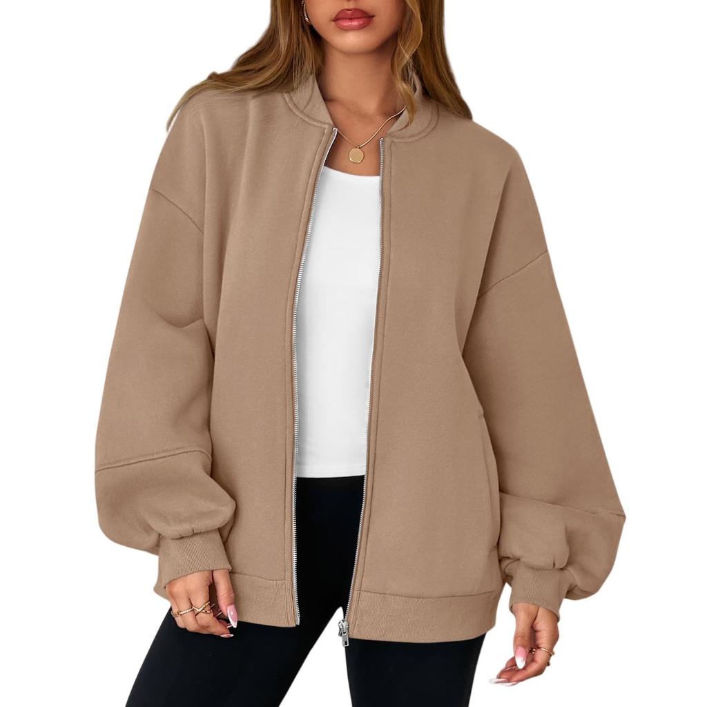 Women's Fashion Long Sleeve Solid Color Round Neck Loose Oversize Zipper Jacket