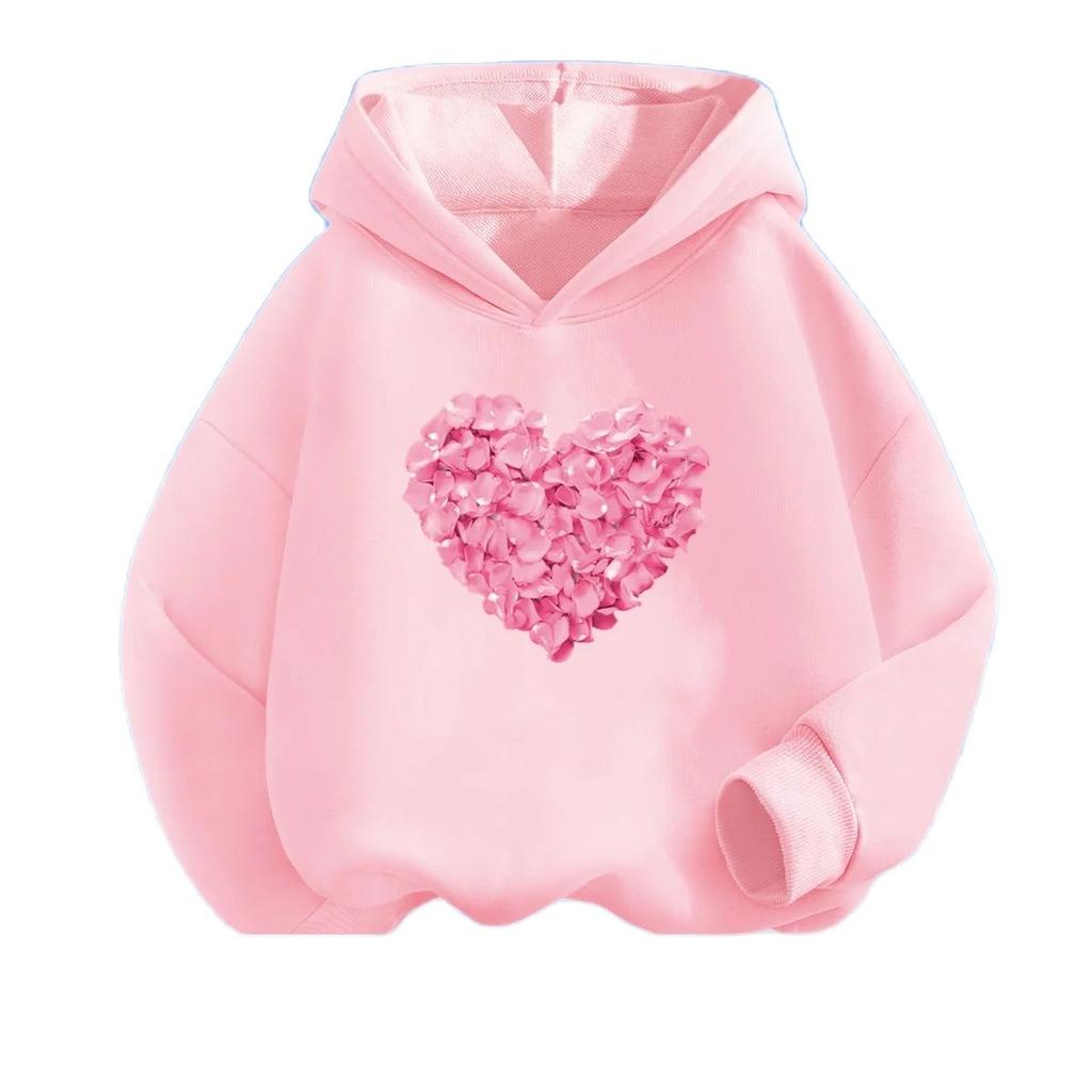 Pink Heart Flower Print Hoodies Girls Long Sleeve Pullover Loose Sweatshirt Spring Autumn Cotton Basic Top Fashion Clothes