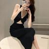 Mote Sexy koreansk strikket genserkjole Kvinner Sommer V-hals Ermeløs Hollow Out Slank Bodycon Kjole Femme Split Lange kjoler 29094