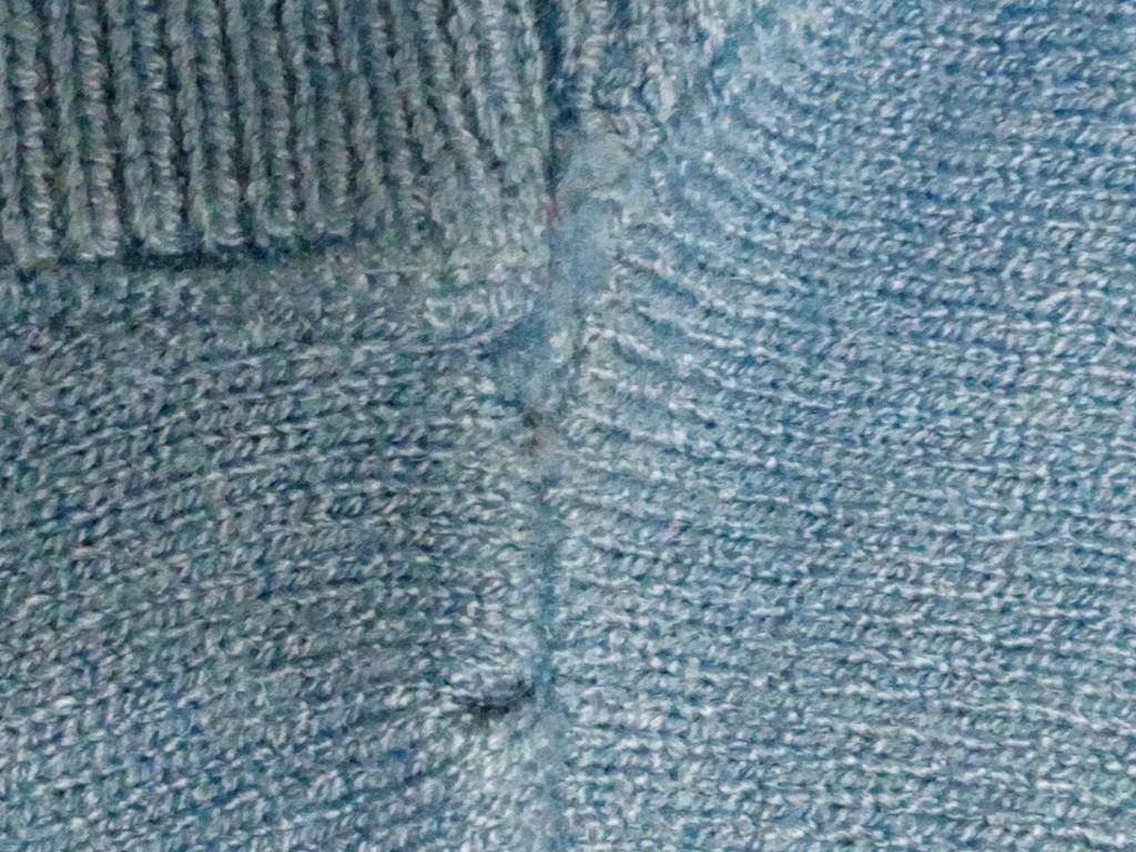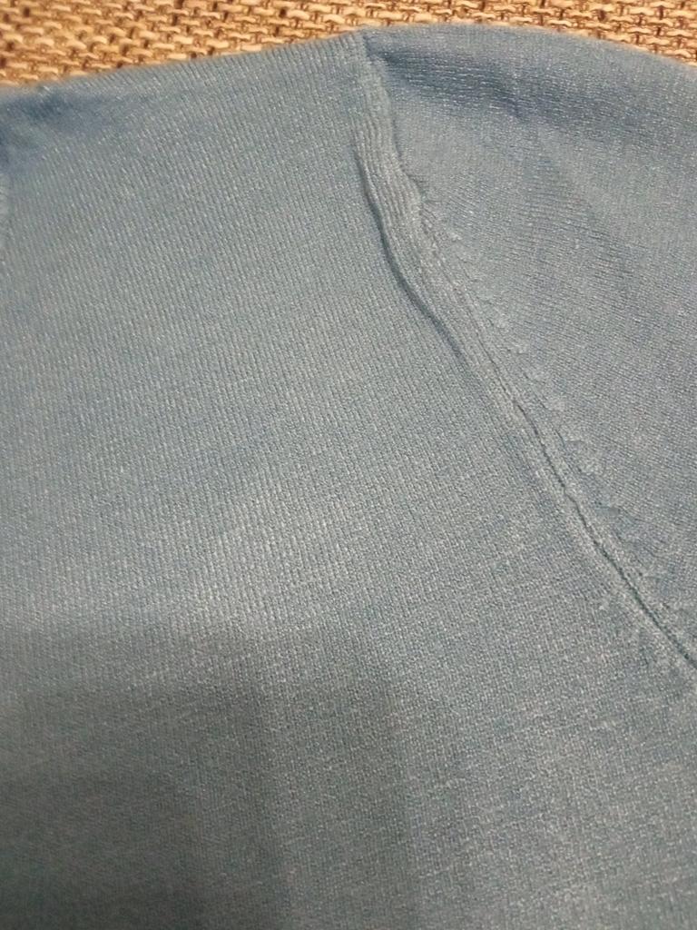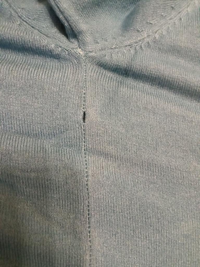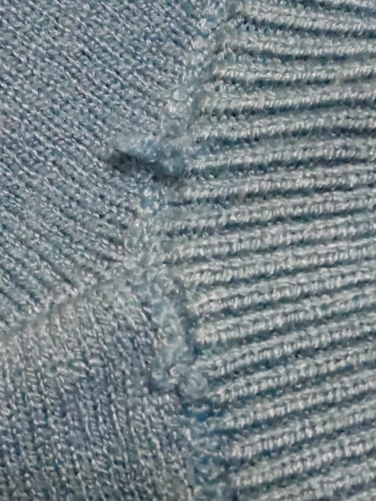 Blusen er dårlig laget, det er løse hemper i halsen, det er hull i sidesømmen, og det er hvitaktige flekker igjen etter stryking.