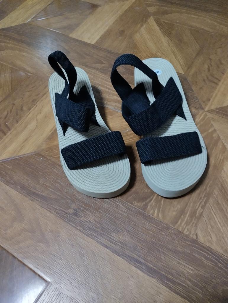 Lett strandtøy, størrelse 38. Jeg kjøpte disse i størrelse 39, og de passet veldig bra. Sandaler med strikk og det er ikke behagelig å gå, de støtter ikke foten i det hele tatt
