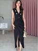 Merino Wool Blend Pleated Slimming Dress with Gold Buttons